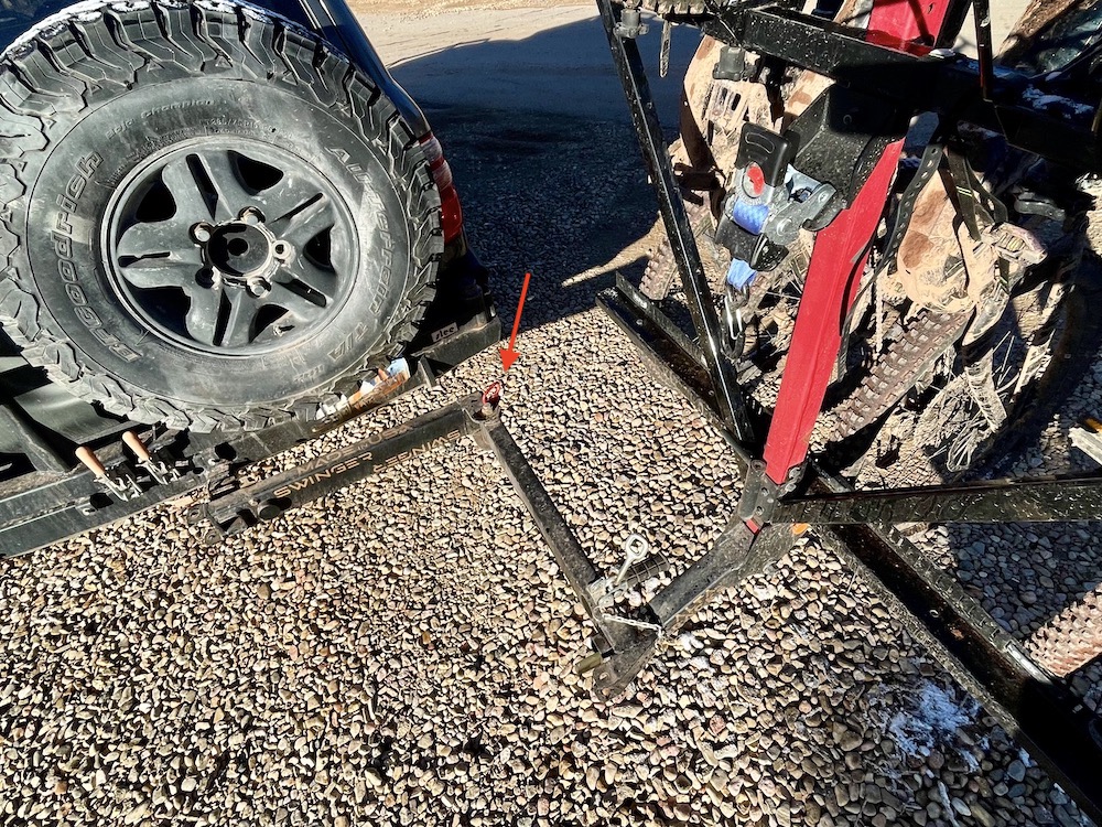 The Swinger works via a heavily-engineered pivoting arm that allows the rack to extend away from the vehicle’s hitch. Once open, the swing-out can be locked open by a robust red metal pin that easily slides into place (red arrow pointing to it below). The Swinger can be configured to swing out to either side of the vehicle, but can’t be done on the fly and takes some modifications to switch it.