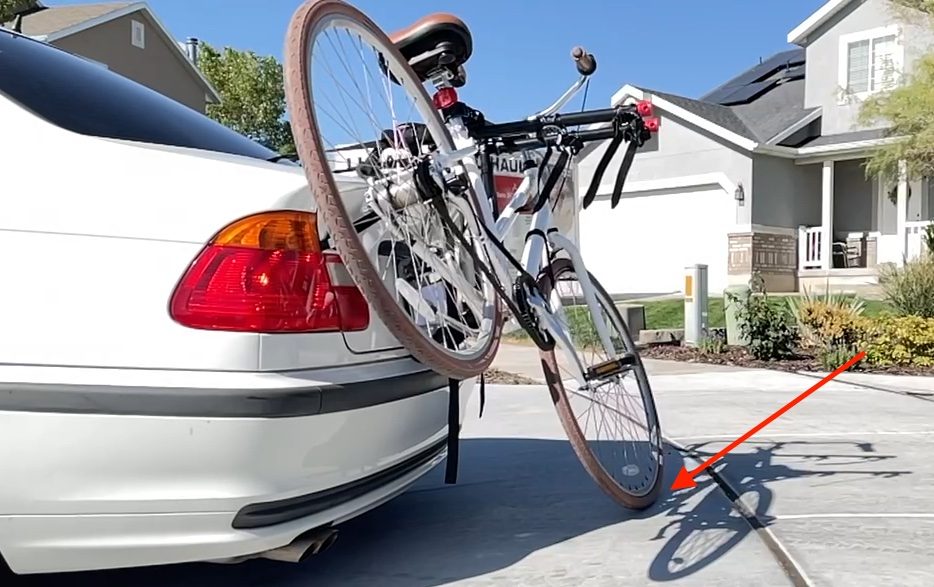 Is it really easy to load a bike so that the rear wheel extends over a foot past one side of the car. (Top image below). Not ideal! Bikes, especially larger bikes, should be centered on the rack to protect the bike’s rear wheel from getting hit while on the rack.