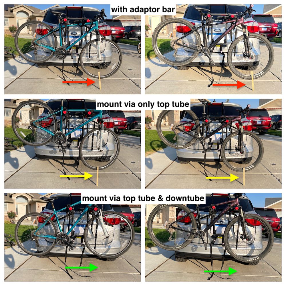 Be aware, however, that using an adapter bar does lower the bike on the rack. This is especially problematic with low cars (such as small sedans) when you are hauling larger bikes with 27.5 or 29″ tires. With an adapter bar, the front wheel of the bike can hang over a foot below the bumper of the car, which puts the wheel at a much greater risk of being damaged.