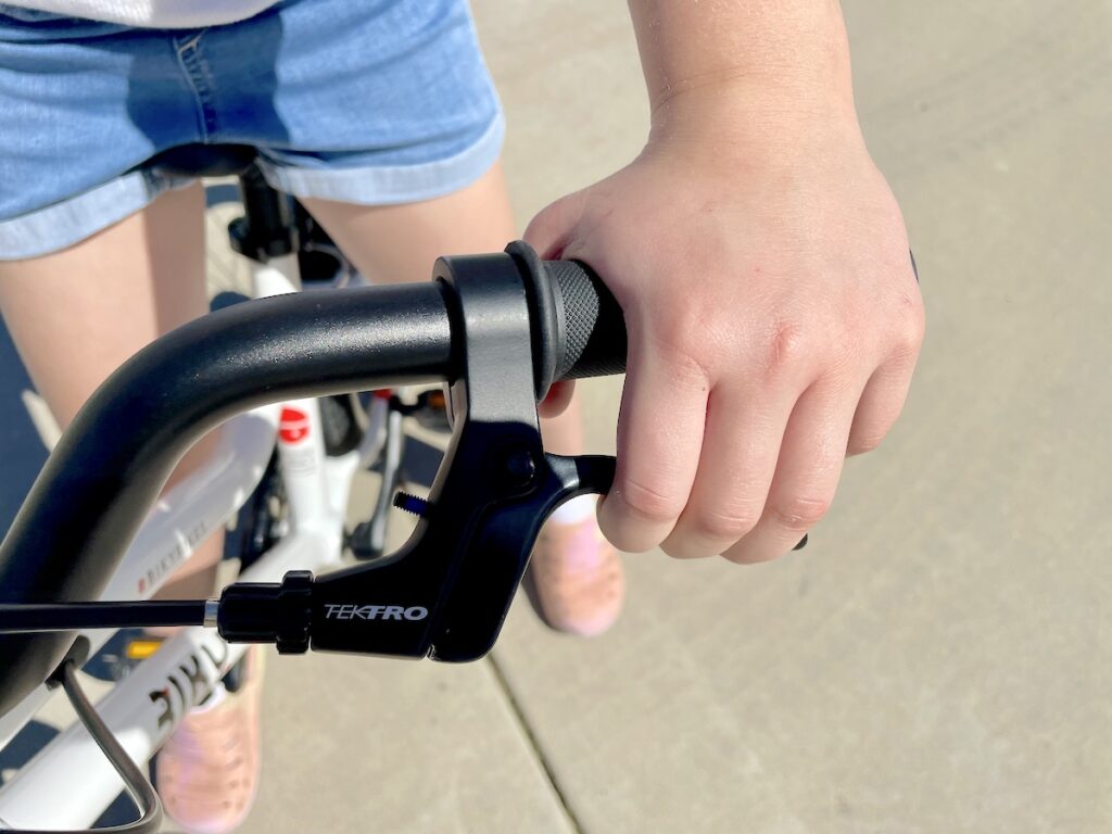 The Biky 20 is equipped with powerful dual Tektro handbrakes, offering plenty of stopping power. The small brake levers were easy to reach and simple to pull for our young testers.