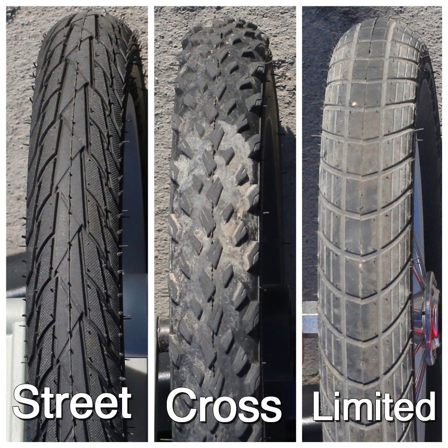 - Cross: Knobby tread air tires for all-terrain riding