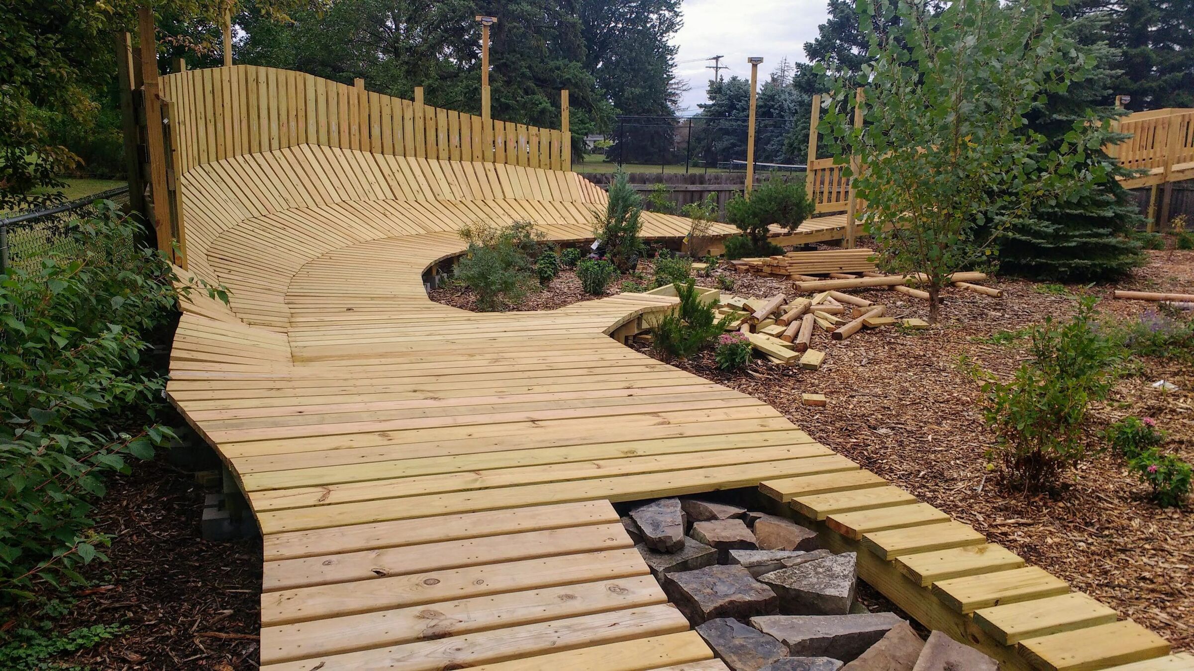 - Mowing and weeding underneath features is a pain. We put wood chips under everything. You can also put cardboard down underneath the wood chips to further prevent weeds and grass from growing.